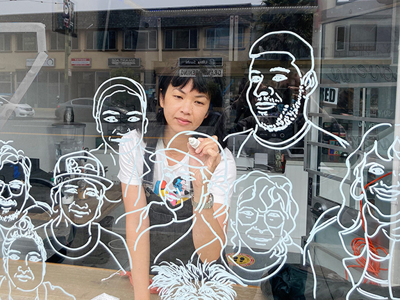 Bee Betwee is a visual artist based in San Francisco, California. Inspired by bold and colorful advertising, she utilizes a variety of styles from illustration, surrealism, photography, and animation. Her current work brings the community together with interactive portrait drawings through window installations, Her art is light hearted and fun. Bee graduated from the University of Santo Tomas, Manila, Philippines with a degree in Fine Arts and Design.