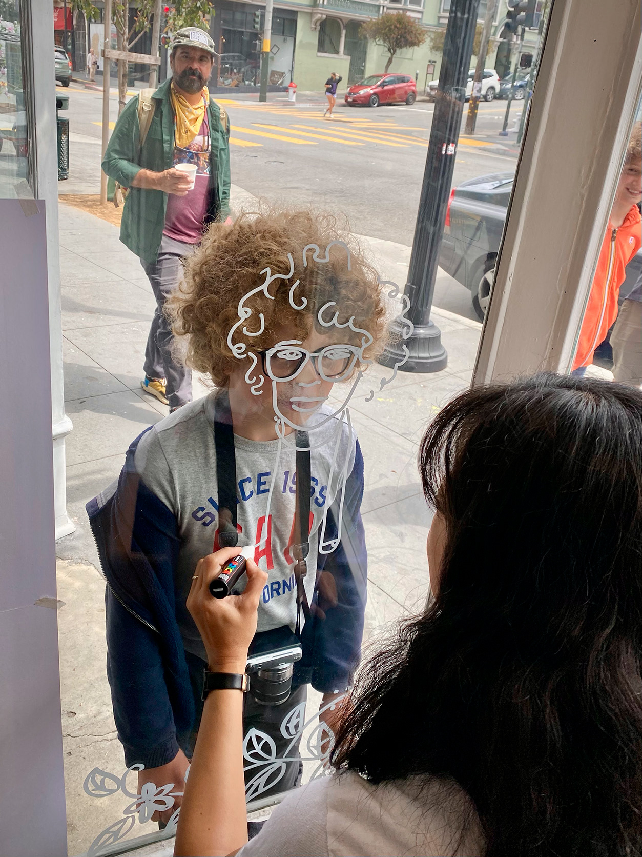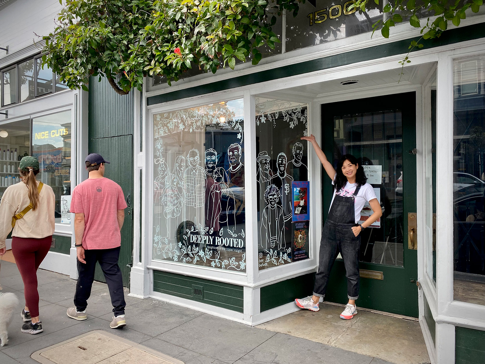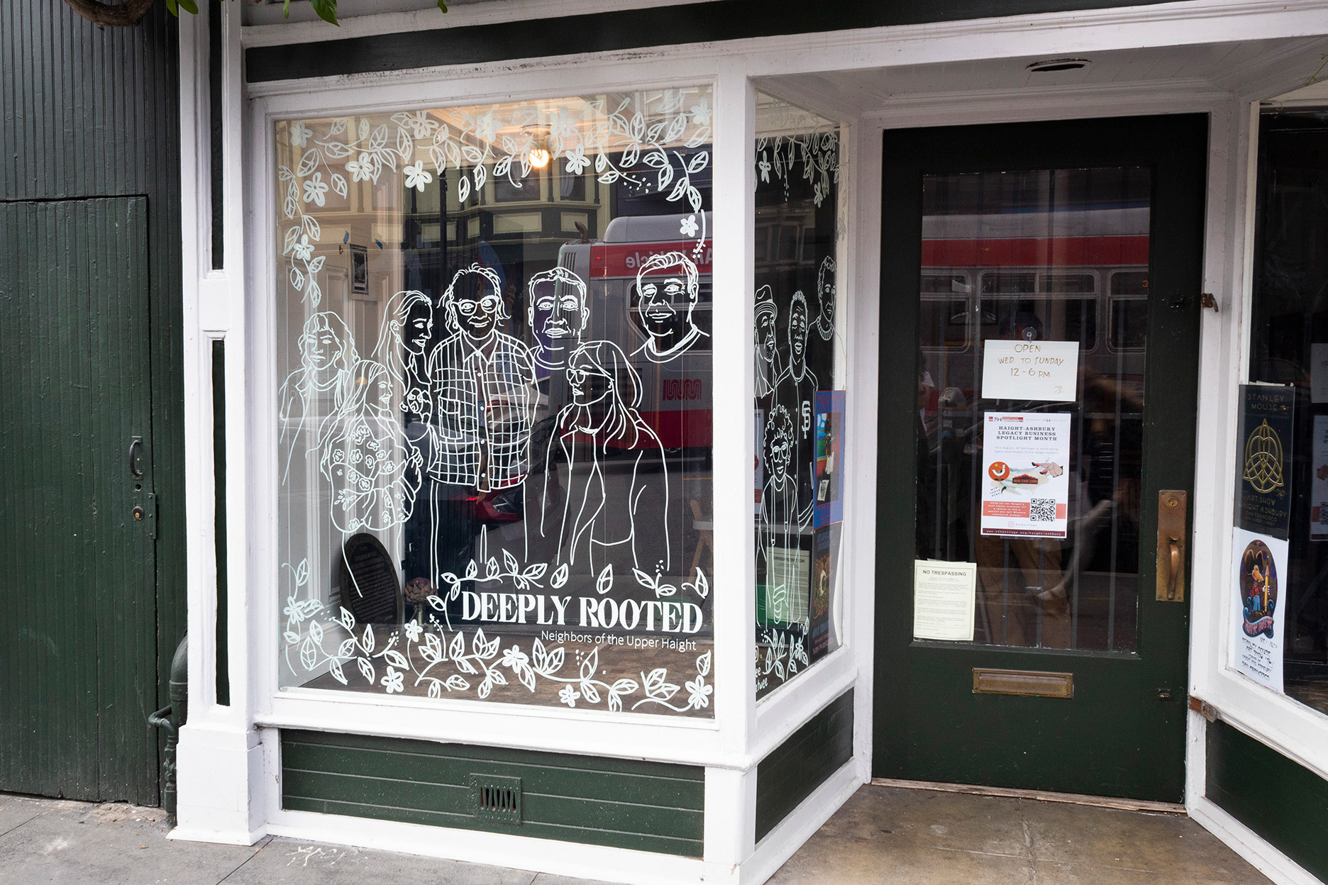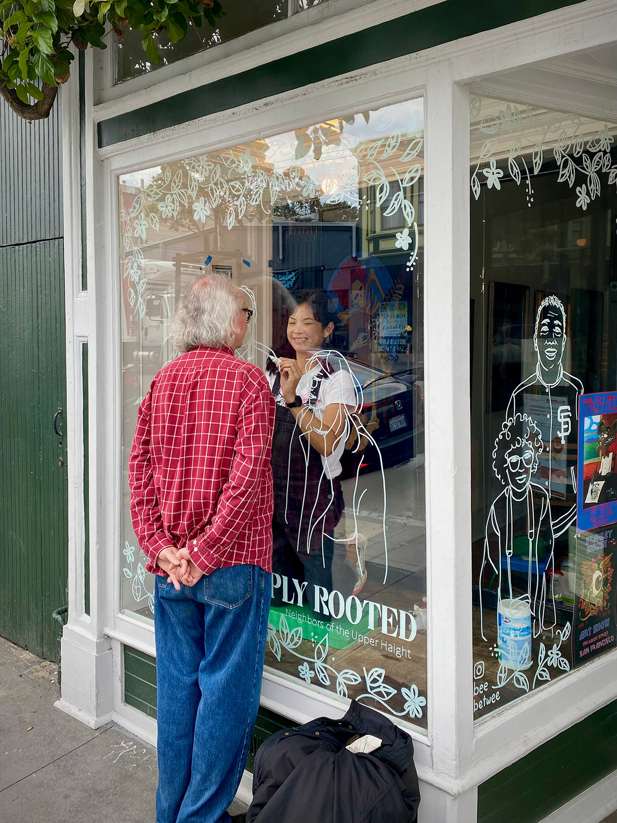 "Deeply Rooted" is a window installation created at the Doolan-Larson Building on San Francisco's iconic Haight x Ashbury street corner. Spotlighting the Legacy Businesses (est. 30+years) of the neighborhood, featured are some of the business owners, staff, and a few neighbors as well. This unique creative process affords me the opportunity to converse with the community members with whom I am sketching, as a way to get to know the neighborhood’s character. Deeply Rooted Acrylic Pen, 2022
