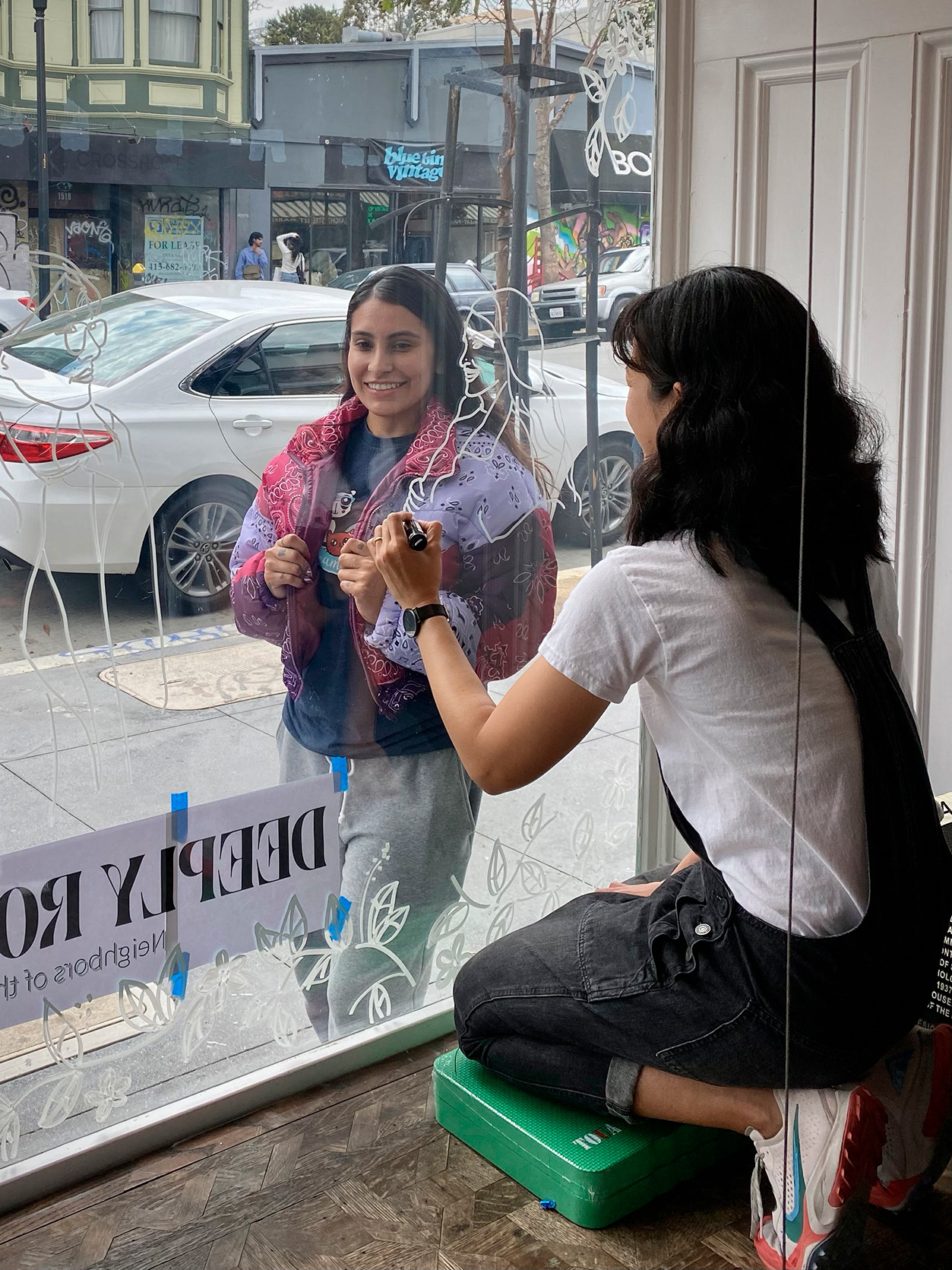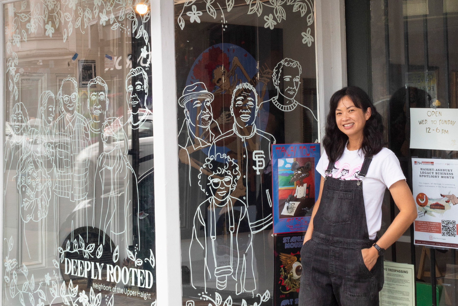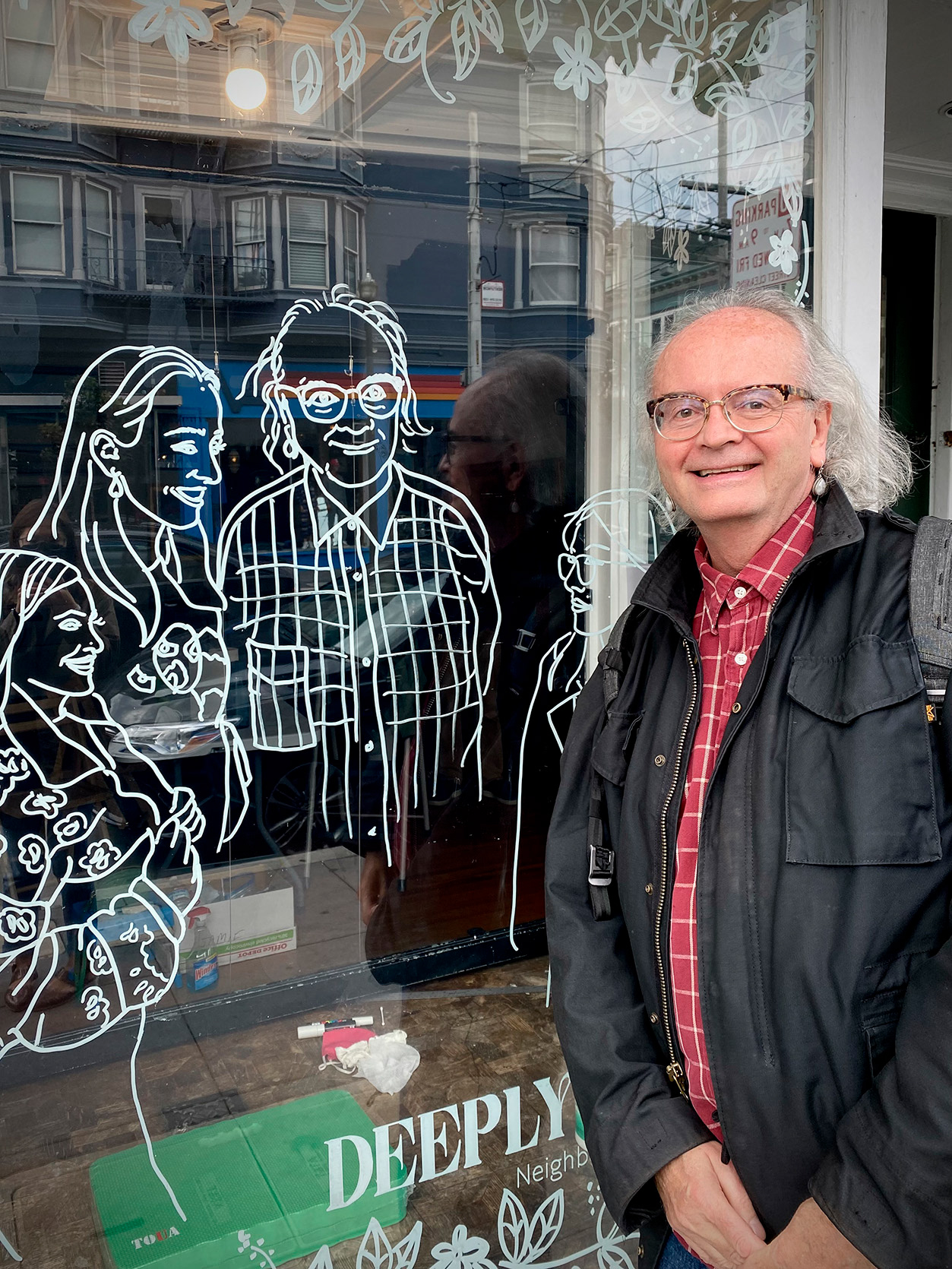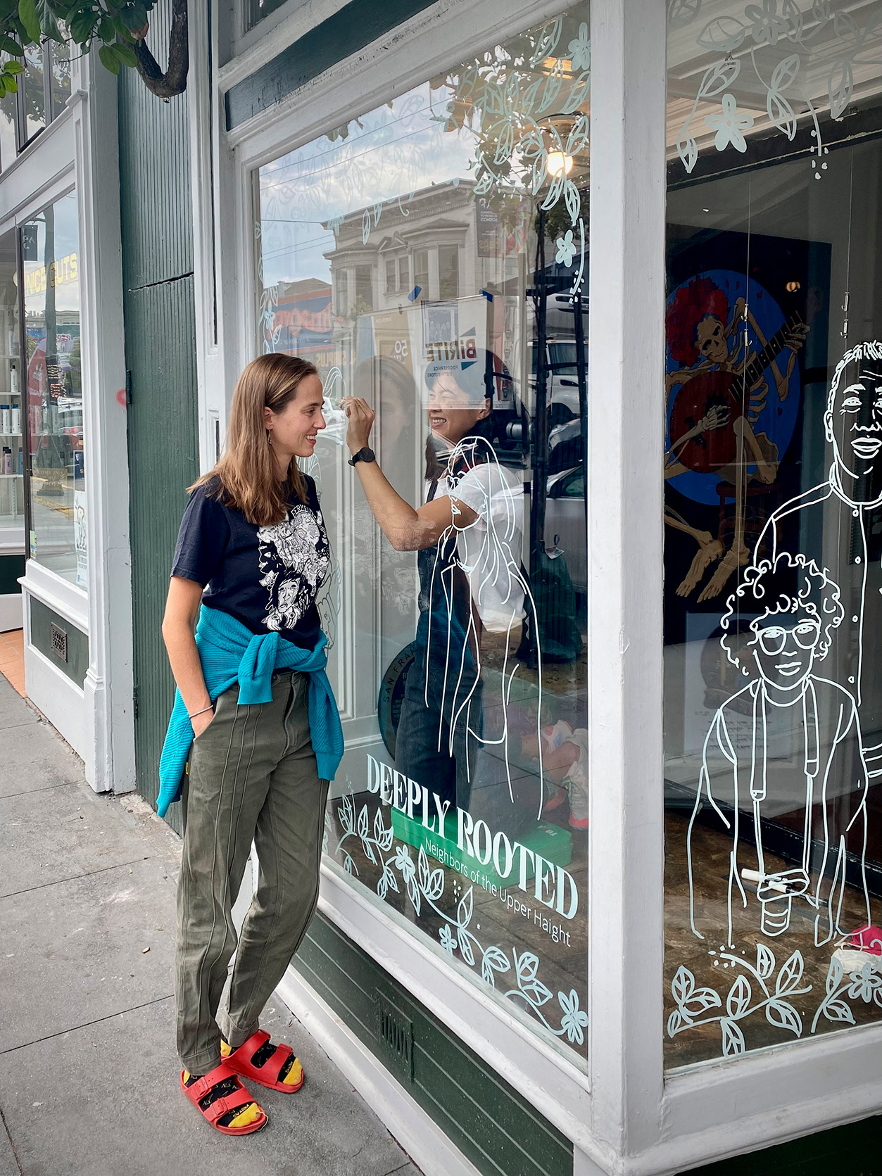 "Deeply Rooted" is a window installation created at the Doolan-Larson Building on San Francisco's iconic Haight x Ashbury street corner. Spotlighting the Legacy Businesses (est. 30+years) of the neighborhood, featured are some of the business owners, staff, and a few neighbors as well. This unique creative process affords me the opportunity to converse with the community members with whom I am sketching, as a way to get to know the neighborhood’s character. Deeply Rooted Acrylic Pen, 2022